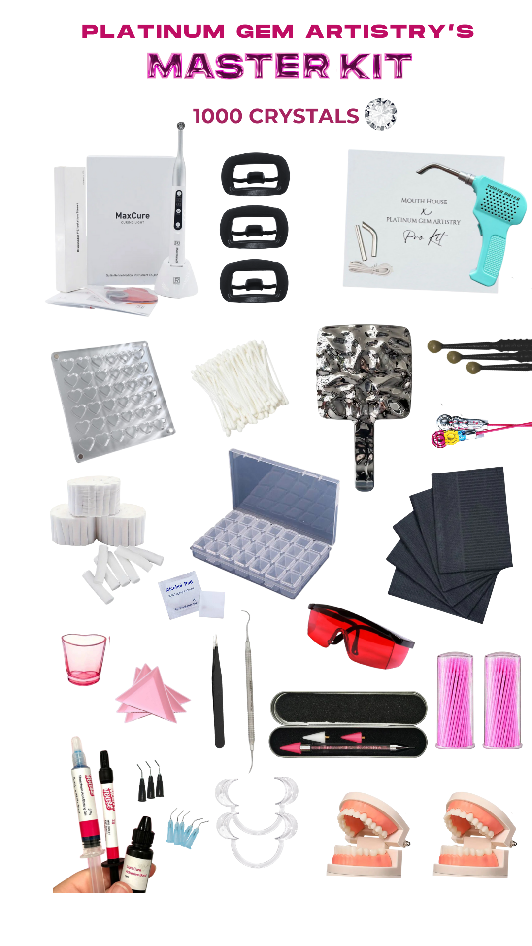 Our Master Kit includes everything you need to become a tooth gem artist, with professional grade tools and over 1000 premium crystals, including the most popular gems from our own collection!